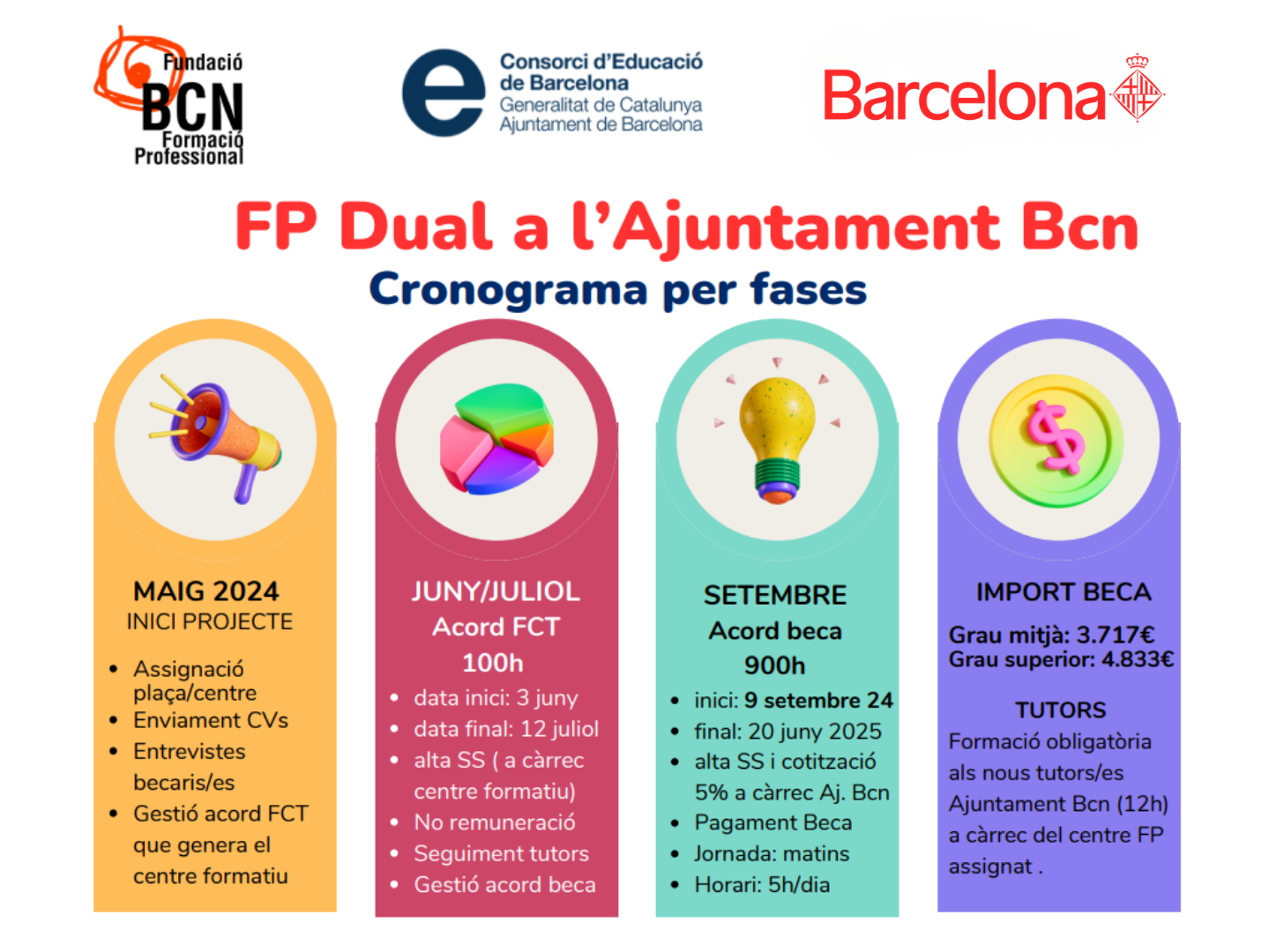 La Fundació BCN Formació Professional funciona com una Unitat Acceleradora de Dual i coordina la petició de places de l’Ajuntament, mitjançant un formulari de sol·licitud (que incorpora enllaços als plans d’activitat dels cicles més demandats) amb l’objectiu d’encaixar les tasques amb el cicle més adequat. Així mateix, ofereix un servei d’assessorament, gestió i difusió del projecte per a tota l’estructura municipal. L’assignació de les places als centres es realitza des del Consorci d’Educació de Barcelona.