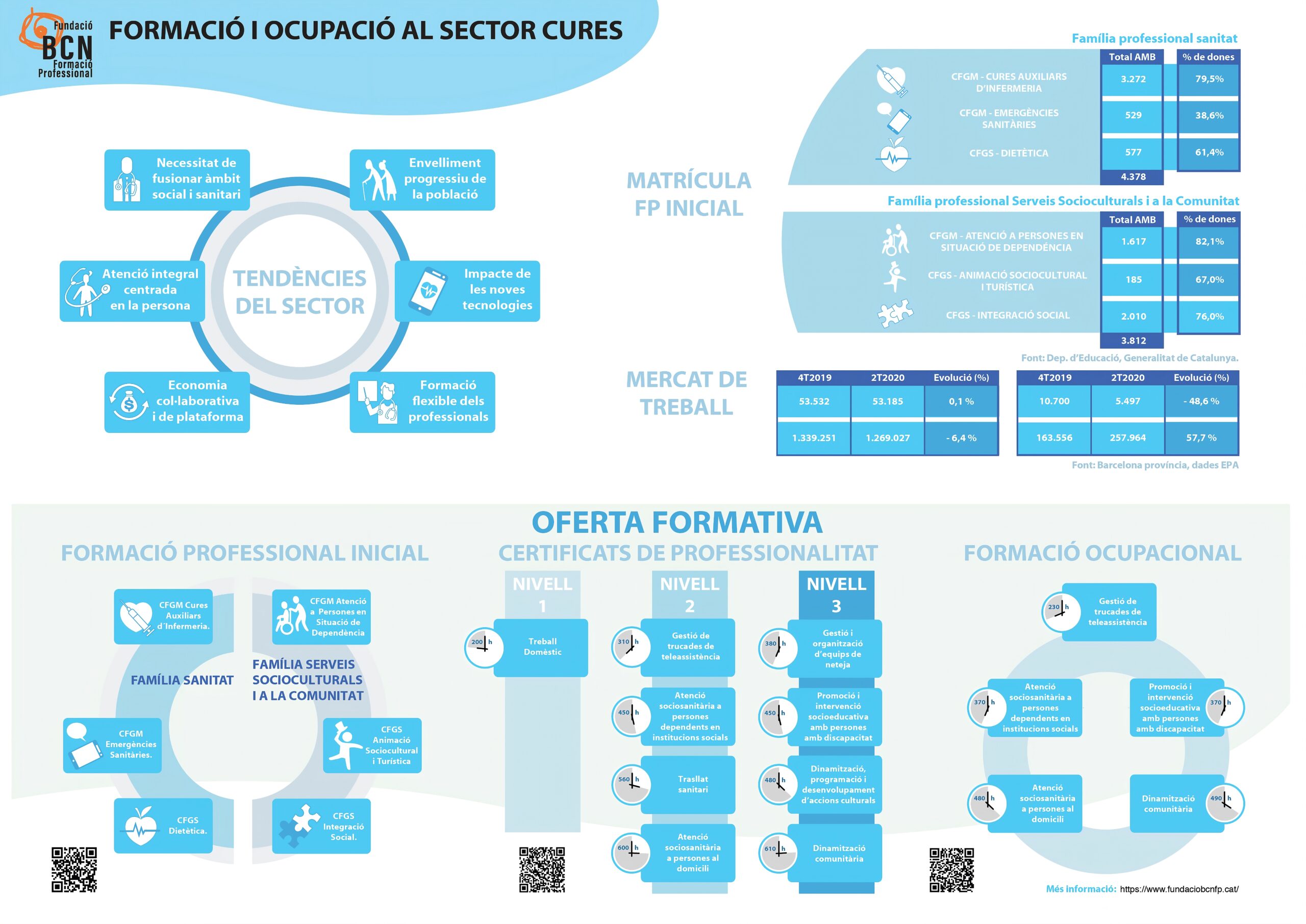 In this study, an X-ray in terms of VET of the current situation in the health sector and of care for the elderly and dependent people is carried out. The analysis carried out involved knowing the characteristics, dynamics and trends of the labour market in these sectors and analyzing with a prospective perspective the training needs of the different VET offers. The innovative trends of these sectors are described and the most demanded, difficult to cover and emerging profiles are identified. All this with the ultimate aim of identifying the potential implications and associated opportunities for strategic planning and the design of the VET training offer.