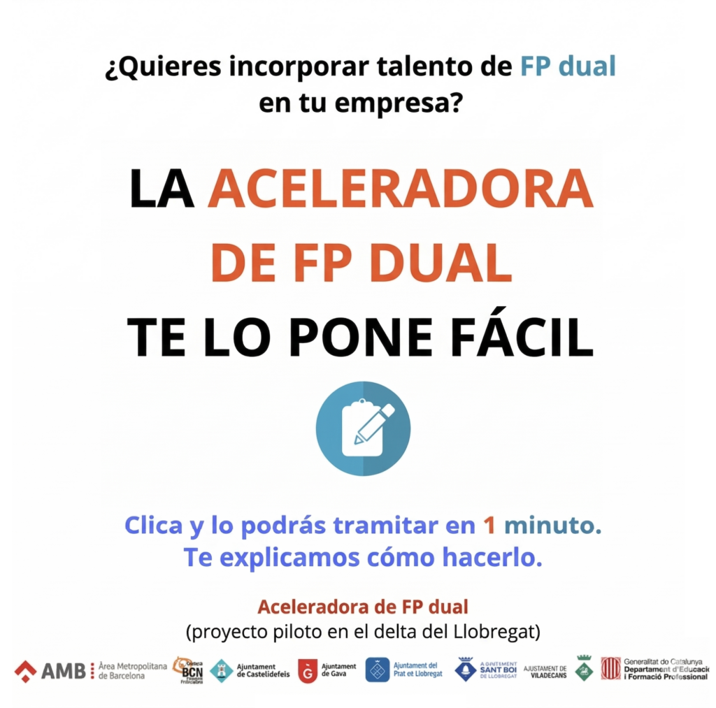 Desde la AMB se impulsa la Aceleradora de FP dual (proyecto piloto en el delta del Llobregat): una iniciativa que agiliza el proceso de inserción de alumnado de FP dual a las empresas del territorio. Es una iniciativa pública y gratuita.