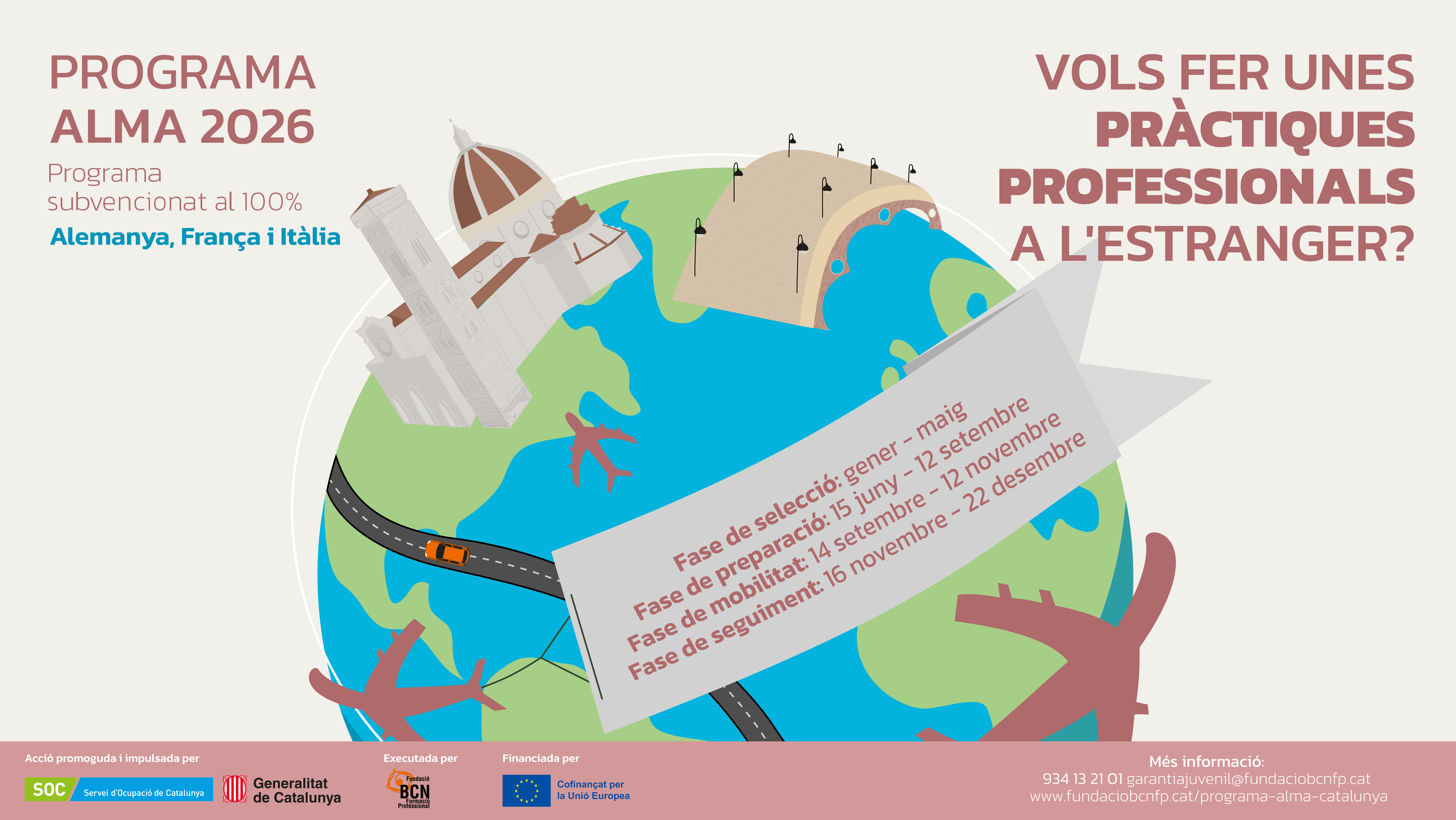 Desde la Fundación BCN Formación Profesional ponemos en marcha la segunda edición del proyecto ALMA, una iniciativa de movilidad europea con enfoque inclusivo dirigida a jóvenes de entre 18 y 29 años en situación de vulnerabilidad. El proyecto se enmarca en el Programa ALMA impulsado por el Servicio Público de Empleo de Cataluña y financiado por el Fondo Social Europeo, con el objetivo de favorecer la inserción laboral, el retorno al sistema formativo y el progreso hacia una inclusión social plena.