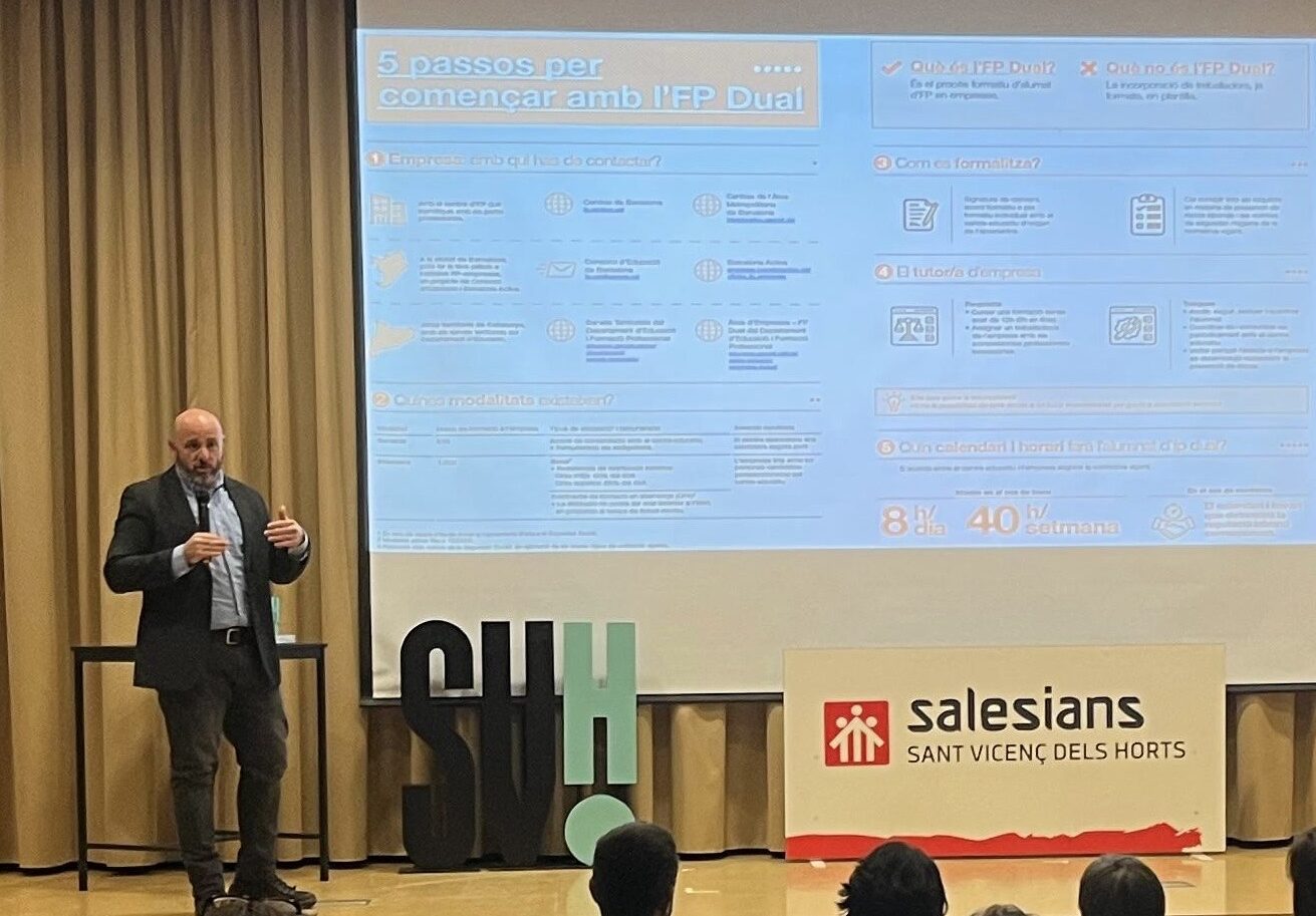 Ens va representar el coordinador del nostre Observatori, Àngel Tarriño, que va compartir la seva experiència i visió sobre els reptes i les oportunitats que ofereix la nova FP Dual. També hi va intervenir la Paula Jesús, antiga estudiant d’FP Dual i actual companya de feina, que va explicar en primera persona com aquest itinerari formatiu li ha obert les portes al seu desenvolupament professional.